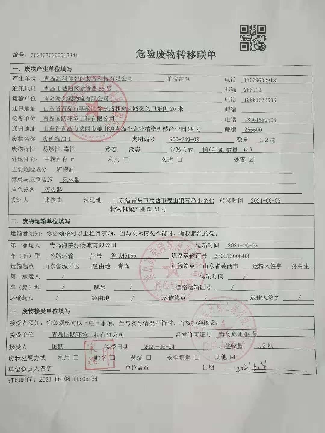 青島海科佳智能裝備科技有限公司固體廢棄物、危險(xiǎn)廢物轉(zhuǎn)移情況:
