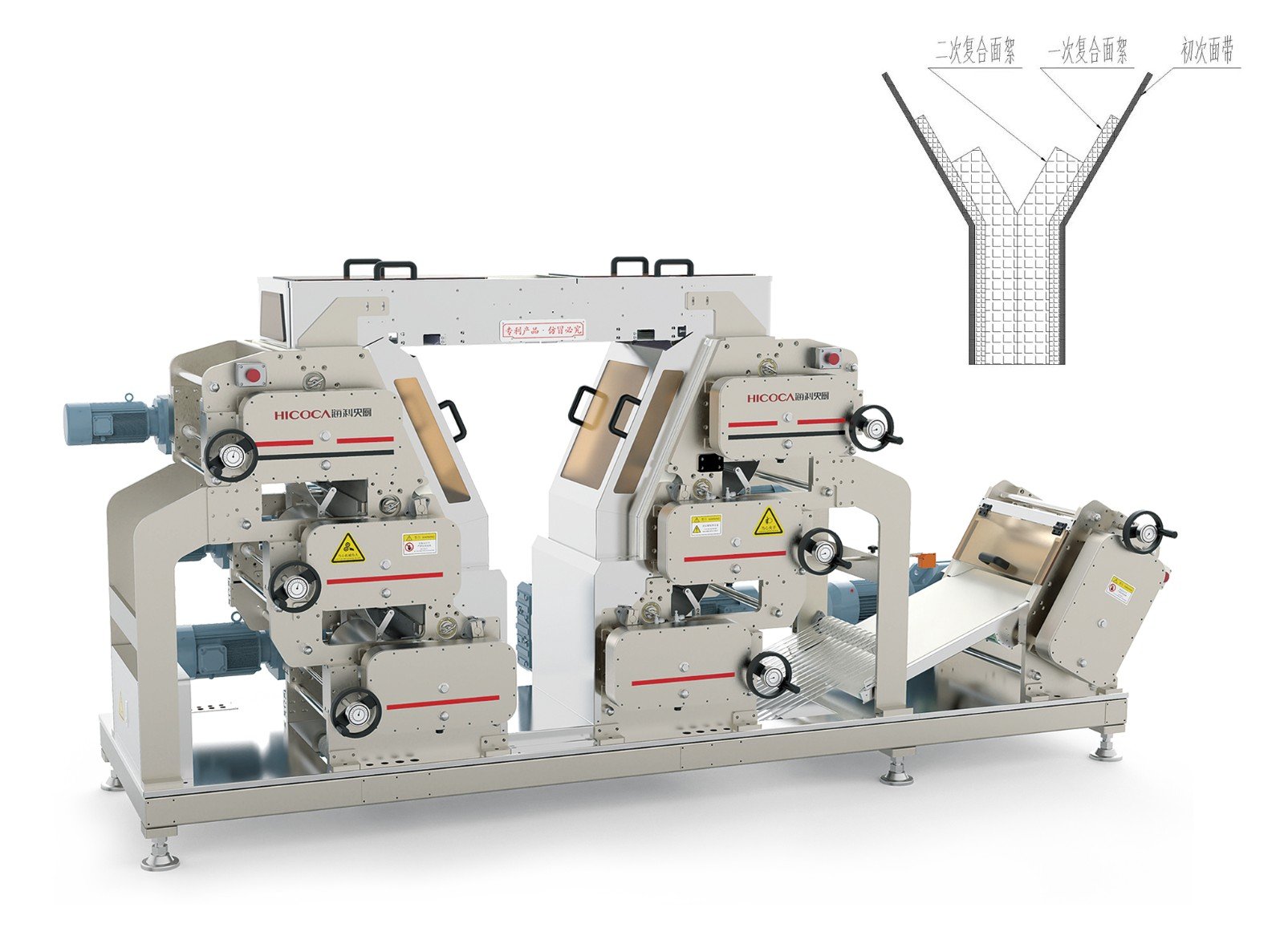 片絮復合壓延機——配有7對高鉻合金輥,整體呈V字型,結構緊湊,布局合理。完成片絮與面帶的3次復合過程,壓制出來的面帶,縱切面密度不同,由外而內,密度依次減小,自然形成密度不同的六層夾層,使面條內松外緊,口感更佳。在煮面過程中可使面條內外同步煮熟,縮短煮熟時間約60秒。