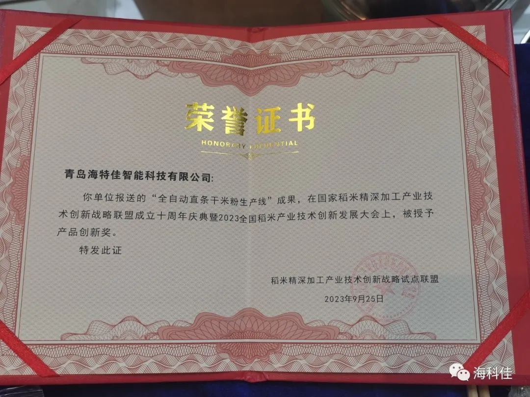 9月24日至26日,國(guó)家稻米精深加工產(chǎn)業(yè)技術(shù)創(chuàng)新戰(zhàn)略聯(lián)盟成立十周年慶典暨2023創(chuàng)新發(fā)展大會(huì)在湖北武漢舉辦。本次大會(huì)以“十年‘稻’路,創(chuàng)新未來”為主題,匯集了中國(guó)科學(xué)院院士張啟發(fā),中國(guó)工程院院士孫寶國(guó)、張洪程、胡培松等專家,以及300多位稻米全產(chǎn)業(yè)鏈的專家學(xué)者、企業(yè)代表共同出席會(huì)議,共同探討稻米精深加工產(chǎn)業(yè)技術(shù)創(chuàng)新發(fā)展。青島海科佳“全自動(dòng)直條米粉生產(chǎn)線”獲得各位專家評(píng)委的好評(píng),在本次大會(huì)上榮獲“創(chuàng)新產(chǎn)品獎(jiǎng)”,并作題為《米粉智能化裝備的發(fā)展與行業(yè)變革》的專題報(bào)告。